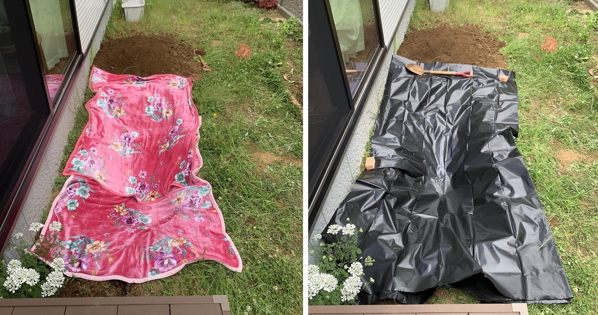 まず毛布を敷いて、その上に遮水シートを被せる。池造りで一番怖いのは遮水シートの漏水である。小石が穴の原因になるといけないので、遮水シートの下地は必要。ブルーシートを使うつもりでホームセンターに買いに行ったら、「養生毛布」と称してこの毛布が売ってた。これ工場のおっちゃんたちが使ってるやつだ!1.5m✕2mで1枚1200円くらい、あぁこれだと思って2枚使った。