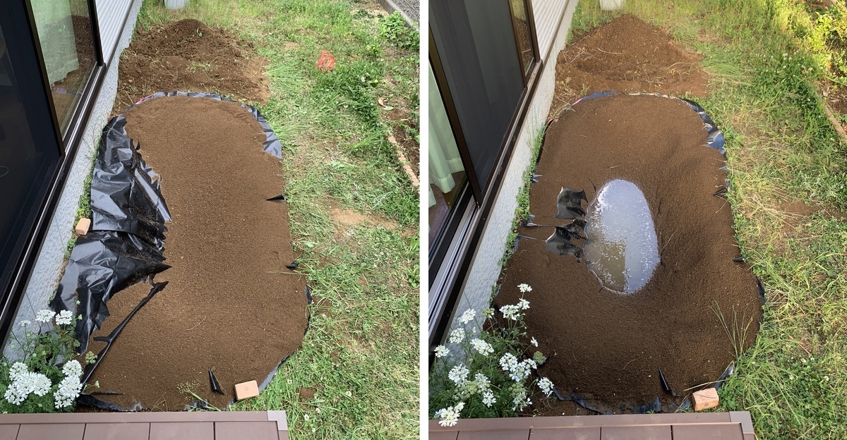 土をふるいにかけるのは一通り被せるまでで、あとはスコップでどしどし土を積んでゆく。写真左右の壁面は急峻なため、水を入れると土が崩れてゆく。へこたれずに崩れなくなるまで土を被せるのみ。元より植物に根を張ってもらうにはそこそこの厚み(少なくとも10cmくらい?)で土がないといけないので、なんせどしどしいく。せっかく堀った穴を埋める虚無感や、池を大きく残したい思いとの葛藤で、心苦しい作業である。これがあるので最初に掘る穴は、作るつもりの池のサイズの、一回り、二回り大きくしておかないといけない。